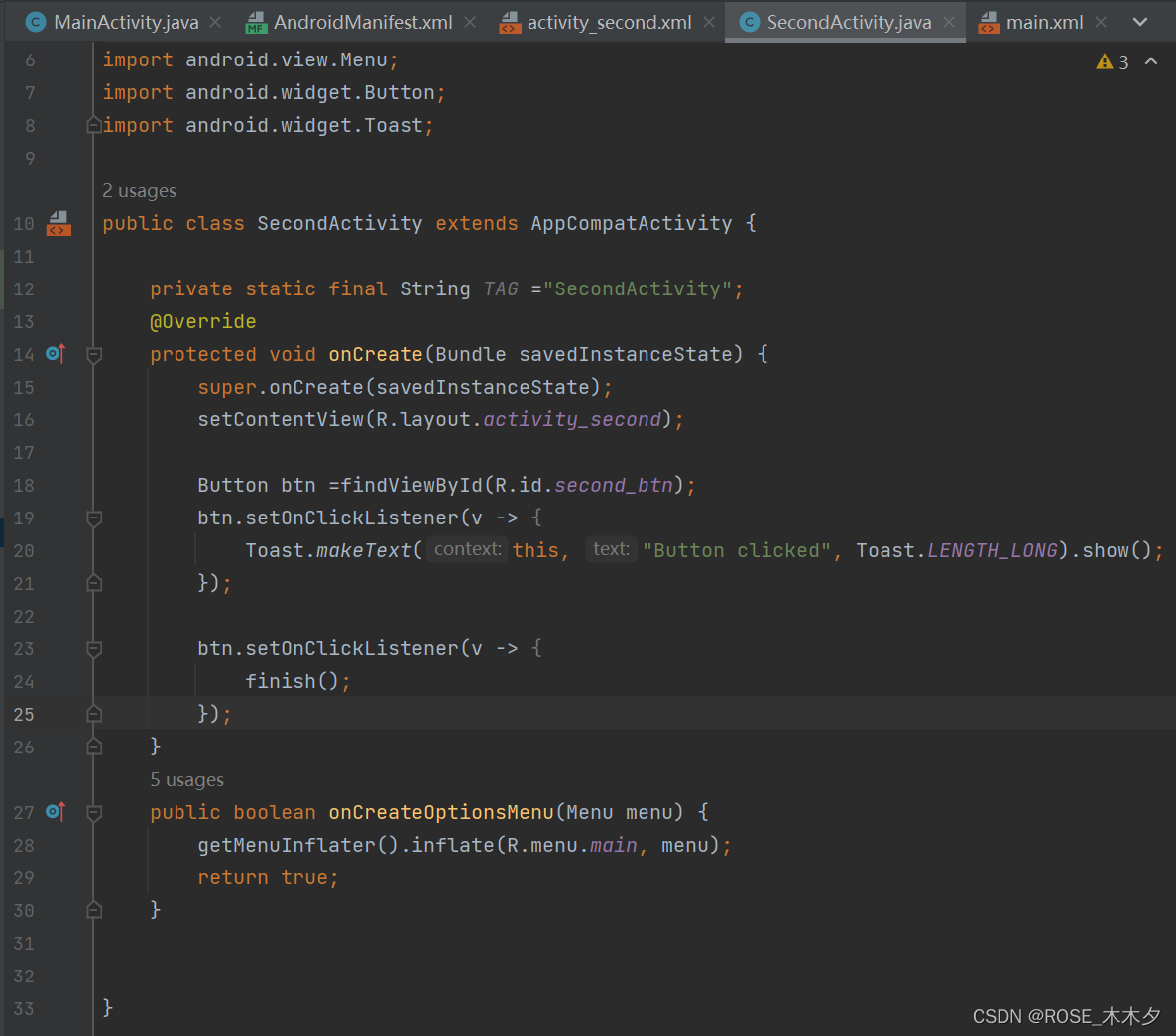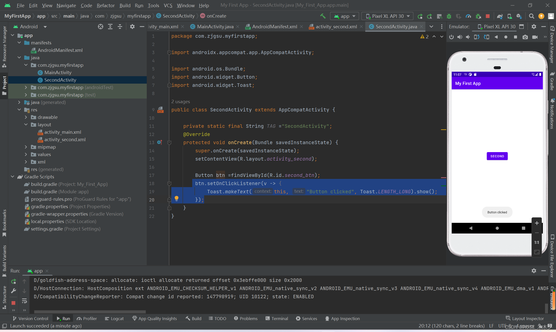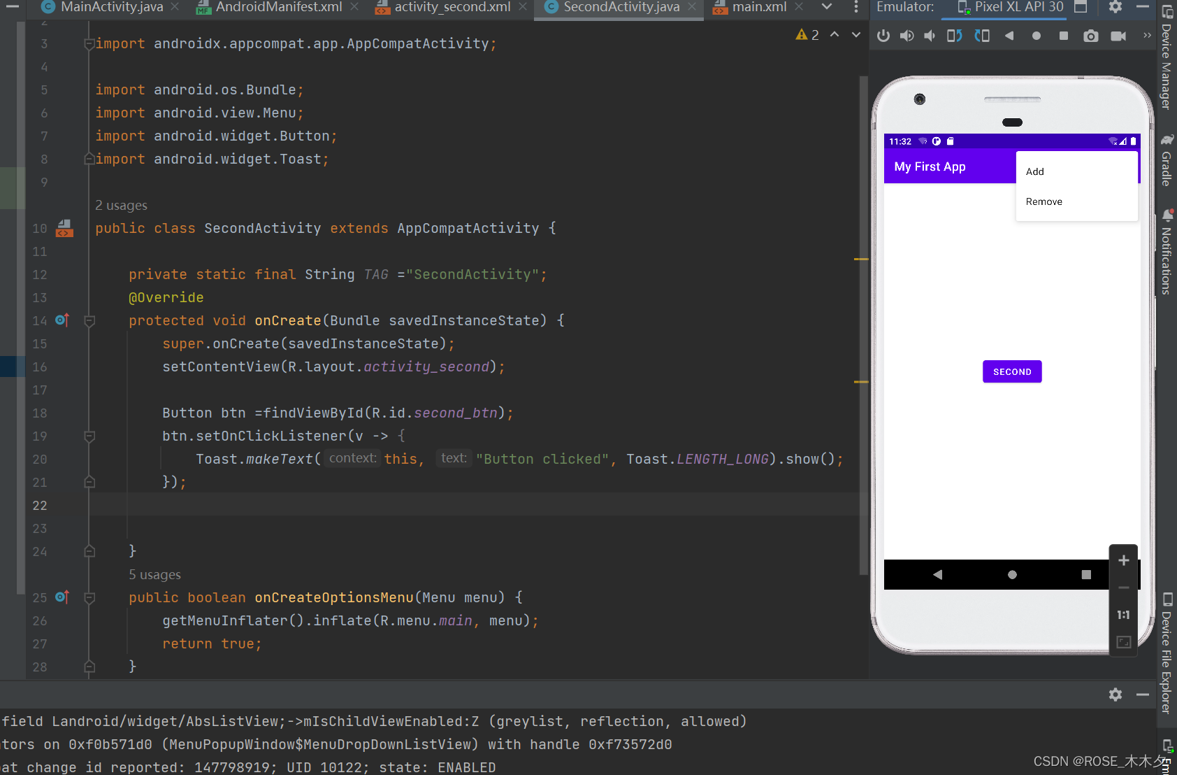 因为我把<intent-filter>移到了SecondActivity下面,后续操作都是对SecondActivity进行操作,所以实际上设置了SecondActivity为主界面,跳转到MainAcitvity。