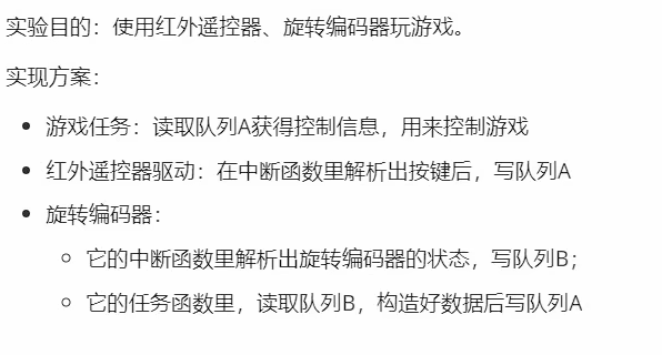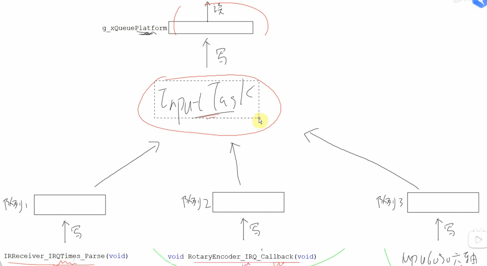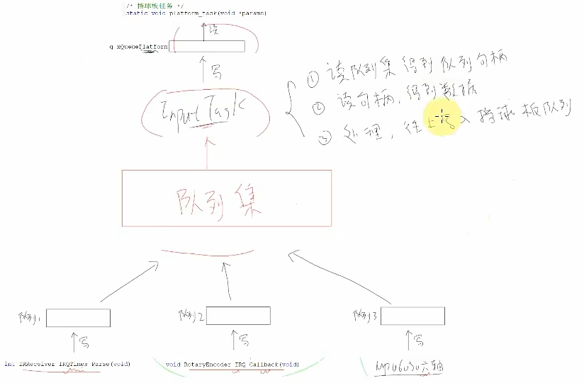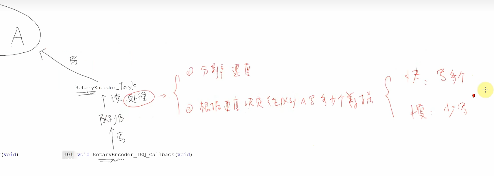 2.同理,旋转编码器中断接收到中断,产生的值放进队列B,然后编码器任务拿到队列b的值并且处理,然后再放到队列A。