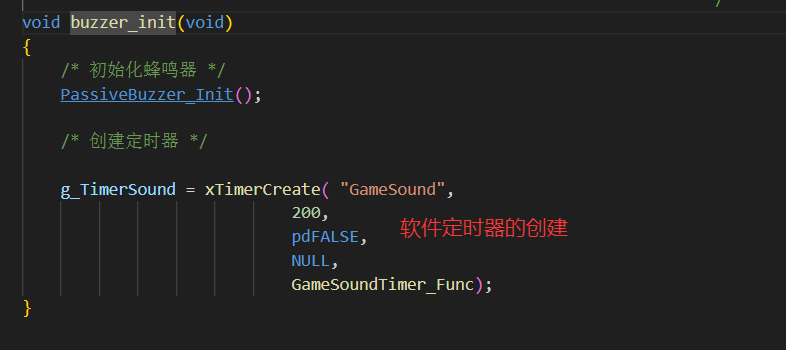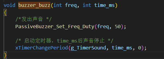 调用这个函数相当于蜂鸣器的开启和定时停止,一开始开启蜂鸣器并设置频率,然后启动定时器的倒计时并修改周期为time_ms,时间到后就会调用回调函数停止蜂鸣器。
