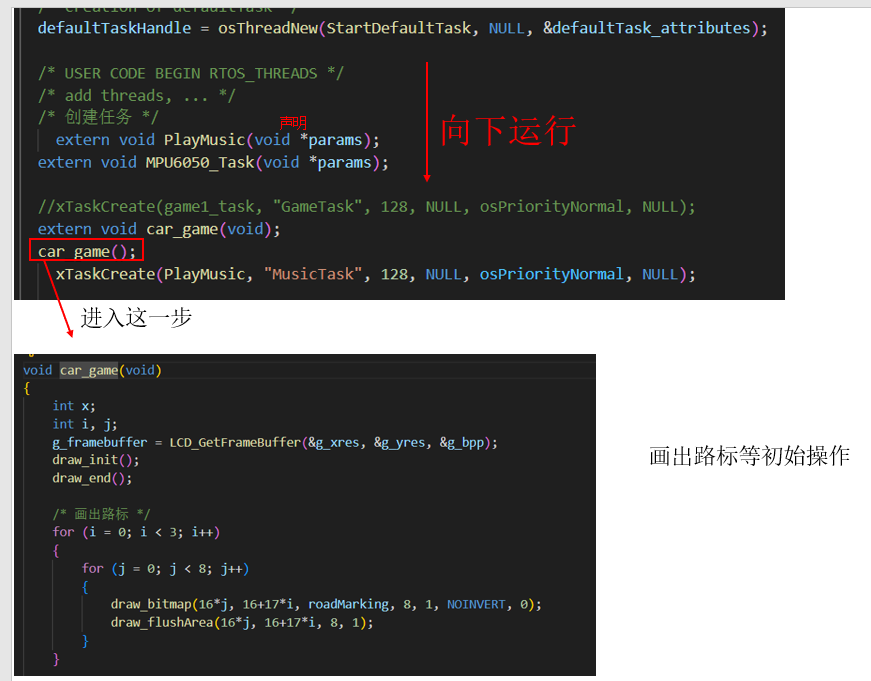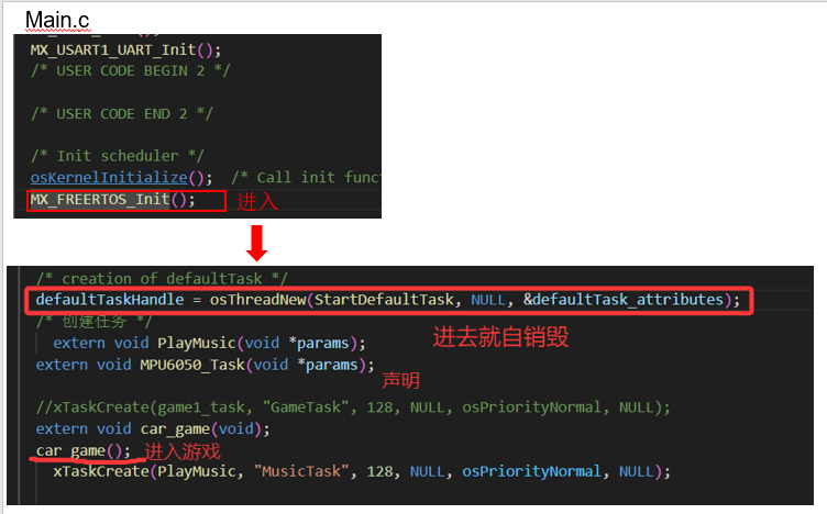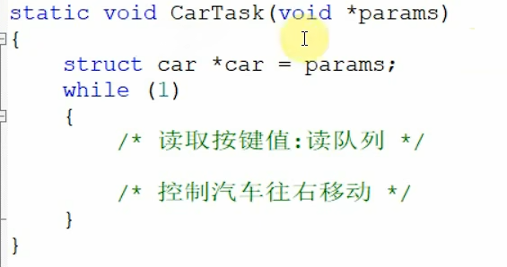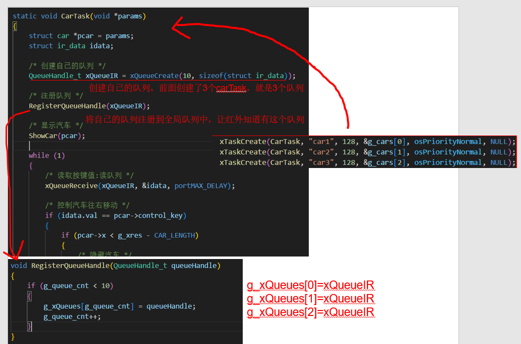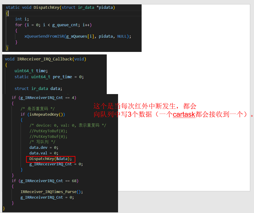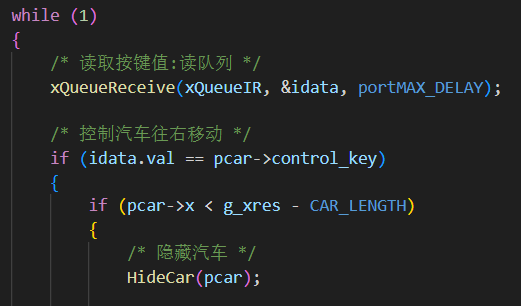 对于一个红外的三个键值控制3辆车,每当按下一个按钮的时候,红外按键会向队列写3个值,分别给到3辆车,只有那辆对应键值的车才会动,此时我们梳理一下程序。