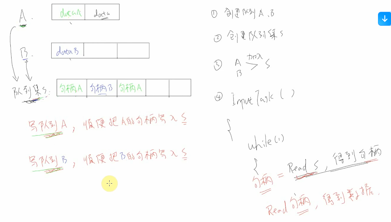 2.阻塞,任务A发送数据到队列中,A不知道数据是给B的,A只会敲敲队列,队列知道要发送给B,因为队列有一个链表指向B。
