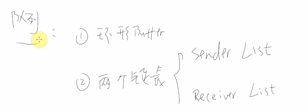 2.两个链表,一个(如果A想发送但队列满了,此时他就会进发送队列)放发送者,一个放接收者(如果B想接收但队列为空,此时他就会进接收队列)