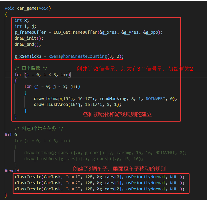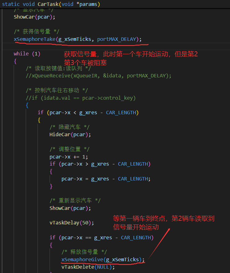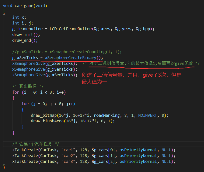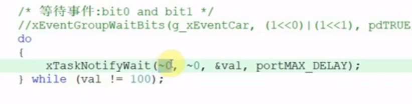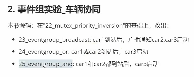 第23个程序,就是先创建一个事件组,然后car1设置写入bit0,car2、car3设置bit0启动,此时car1到达终点后,car2,car3启动了。