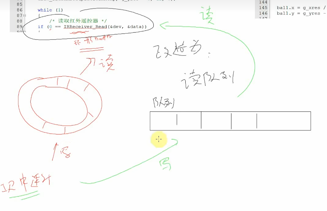 按键按下,红外接收产生中断产生一个值,放进队列A,挡球板的任务接收到这个值就会运动