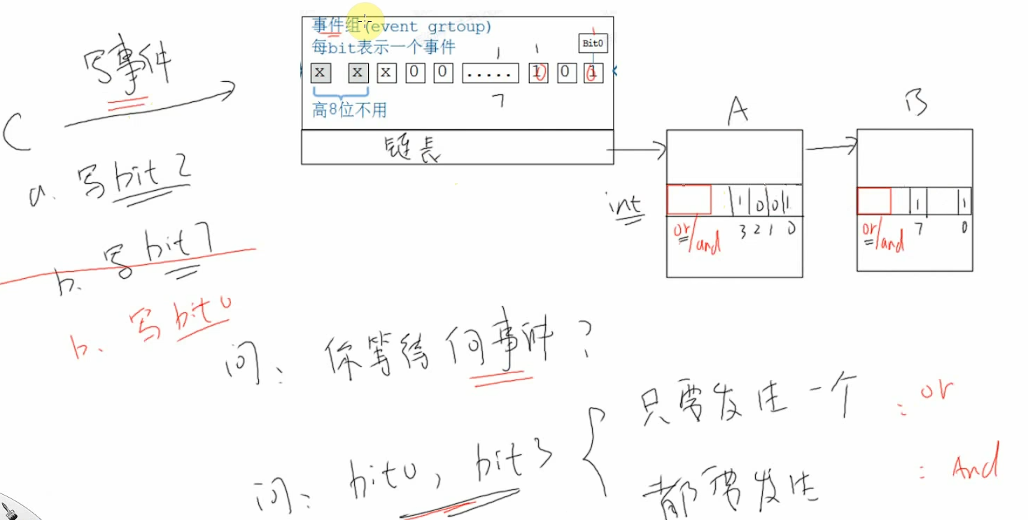 时间组是一个链表。当A和B是如图所示的任务时,写bit2时,任务A、B都不运行,写bit7时,任务B运行,写bit0时,任务A、B都运行。当写入任务时,会遍历整个链表。