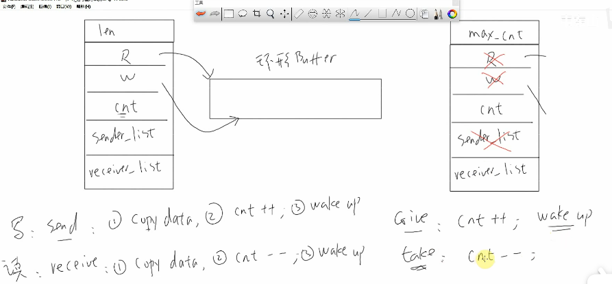 读队列:1.把值copy进任务。2.cnt--。3.唤醒发送队列。