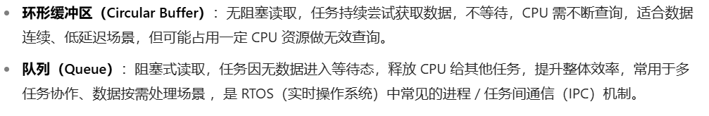 用环形缓冲区的时候,读取的任务不会阻塞(会一直占用CPU资源)。用队列之后读取的任务会阻塞,其他任务就会执行,提高cpu效率。