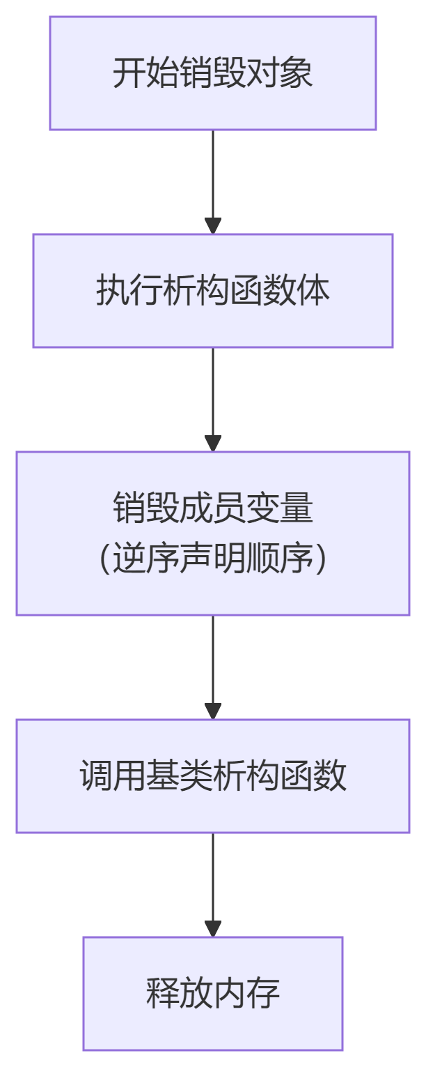 销毁成员变量:按声明逆序调用成员的析构函数