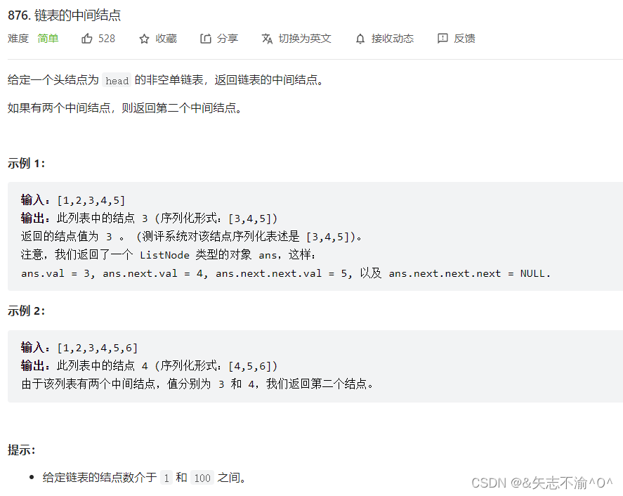 解题方法:单指针法。第一次遍历这个链表,来确定链表的总长度n,第二次遍历链表的半长度,即n/2.这题目难度不高,适合小白做