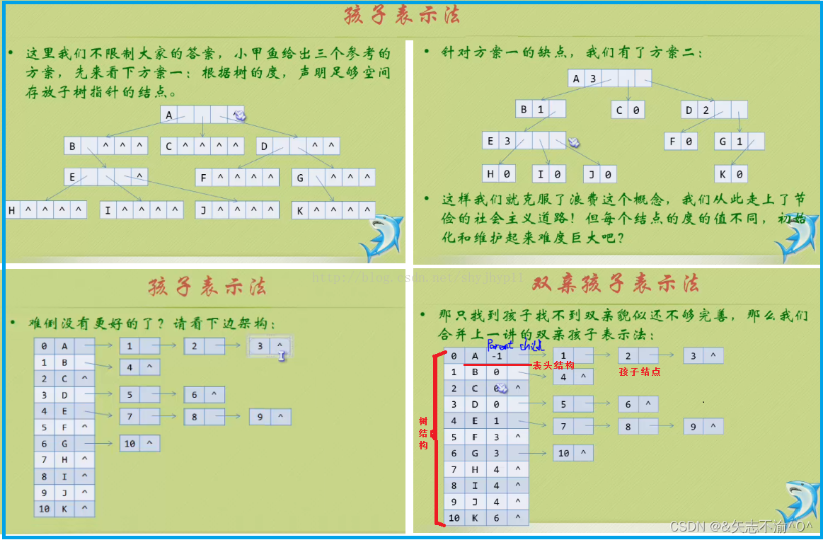 2.孩子表示法:换一种完全不同的想法。由于树中每个结点可能有很多的子树,可以考虑用多重链表,即每一个结点有多个指针域,其中每个指针指向一个子树的根节点,我们把这种方法叫做多重链表表示法。不过,树的每个结点的度,也就是它孩子个数是不同的。所以可以设计两种方案来解决。每个结点指针域的个数等于该结点的度,我们专门来取一个位置来存储结点指针域的个数。如图。如图,data就是数据域。degree是度域,也就是存在该结点的孩子结点数。child1····是指针域,用来指向该结点的孩子结点。