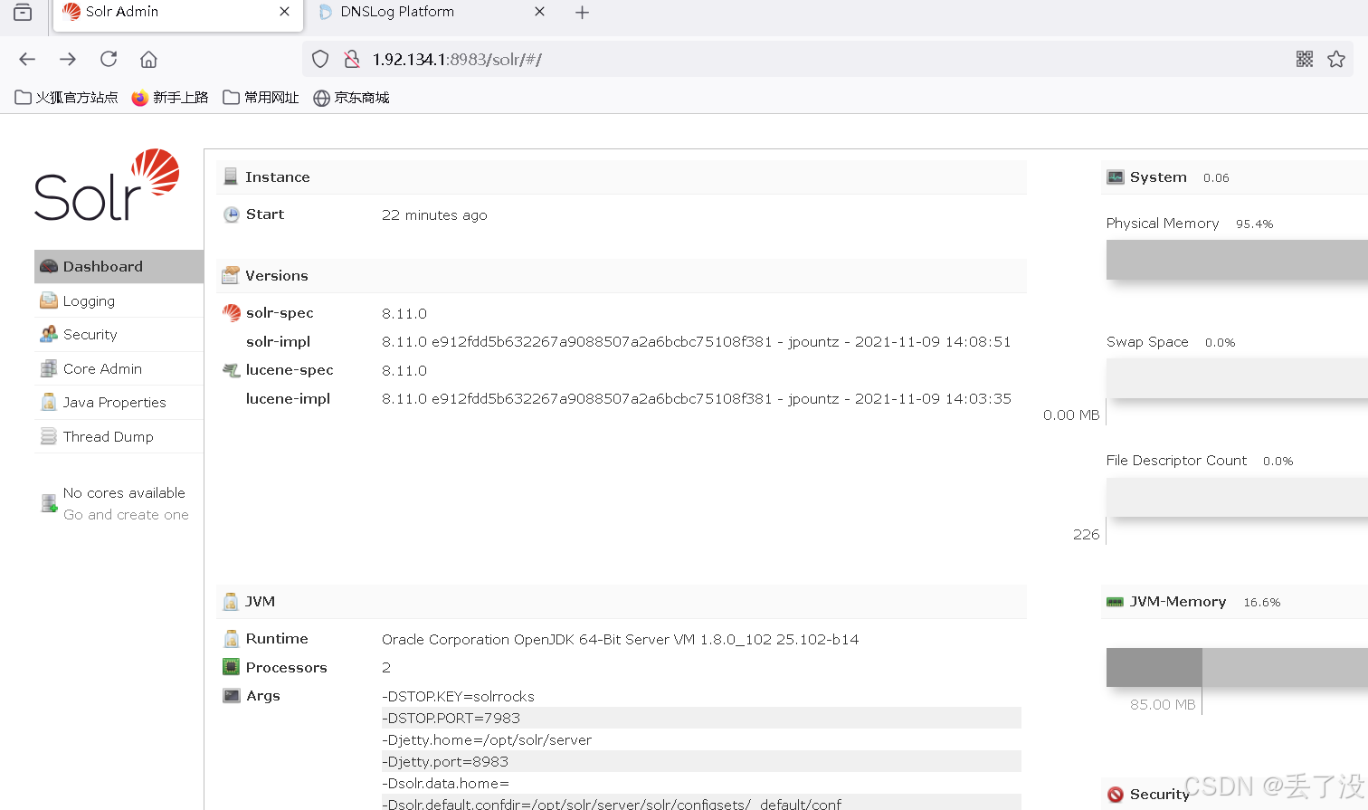 log4j2漏洞复现 可以发现 /solr/admin/cores?action=这里有个参数可以传,可以按照上面的原理先构造一个请求传过去存在JNDI注入那么dap服务端会执行我们传上去的payload然后在DNSLOG平台上那里留下记录,我们可以看到留下了访问记录并且前面的参数被执行后给我们回显了java的版本号!将反弹shell的发送到目标主机的日志里。