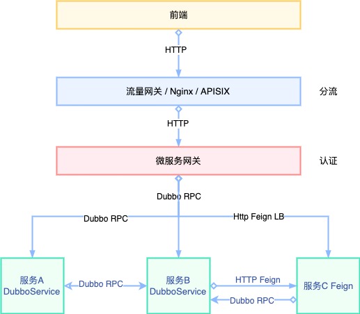 采用 Spring Gateway开发Dubbo网关确认Dubbo网关职责Http协议到Dubbo协议的映射,转化。DubboService返回实体VO,在网关需要把实体VO转为json数据,并且包装为 {"status":1,"data":Object,"msg":"xxxxxx"} ,并根据异常处理不同的状态码其他网关该有的功能,比如验签、url rewriteFeign协议代理功能技术选型直接采用Spring Gateway作为基础来进行开发。这样上述职责中3 和4天然支持。笔者曾经