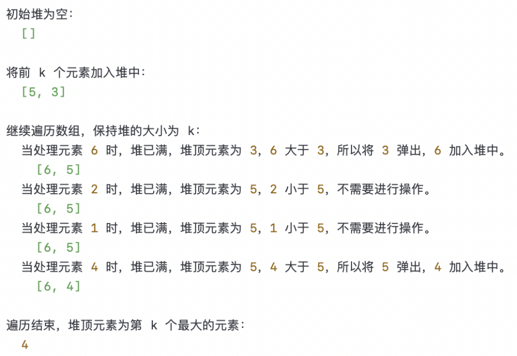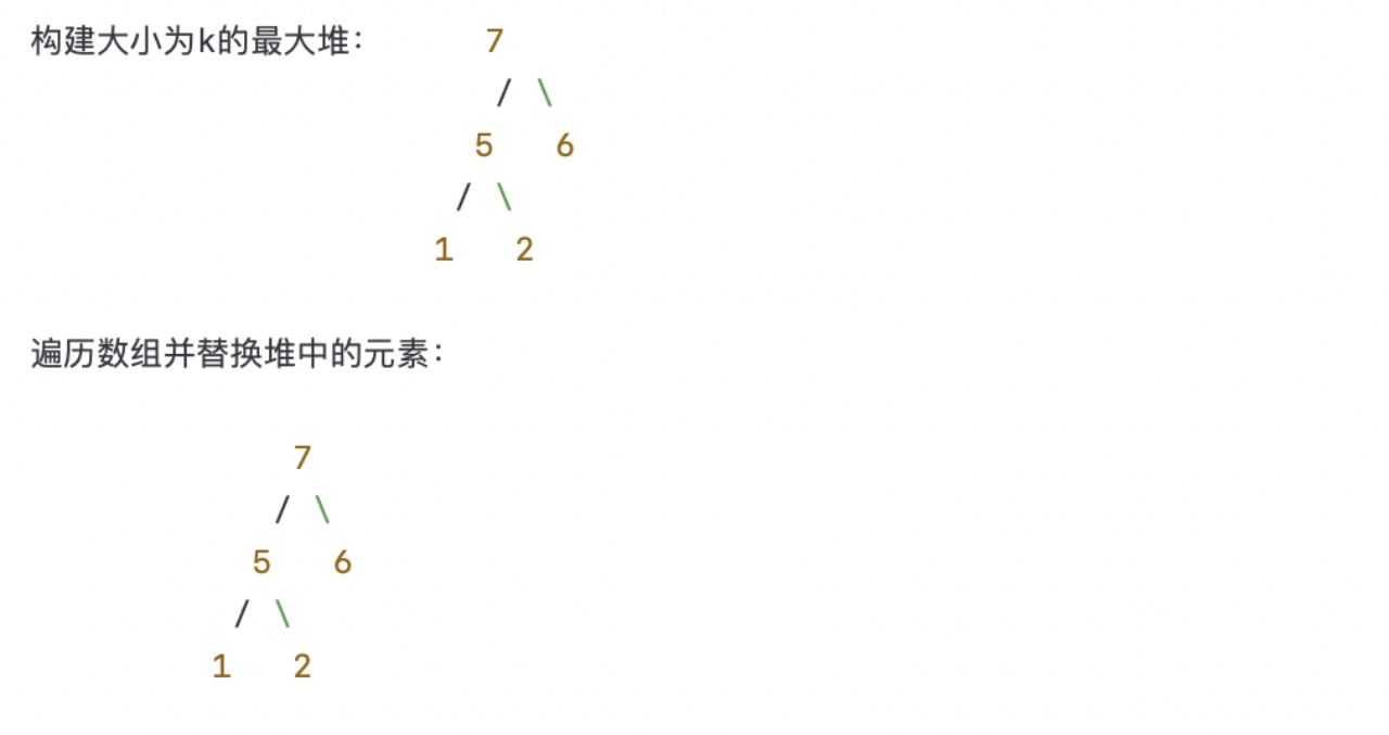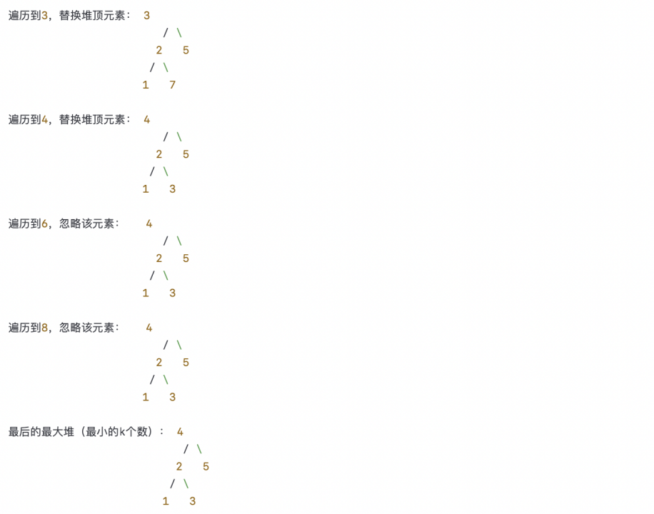 以上简图展示了整个过程,包括初始数组、构建最大堆和遍历数组替换堆顶元素的过程。最后的最大堆中的元素就是数组中最小的k个数。