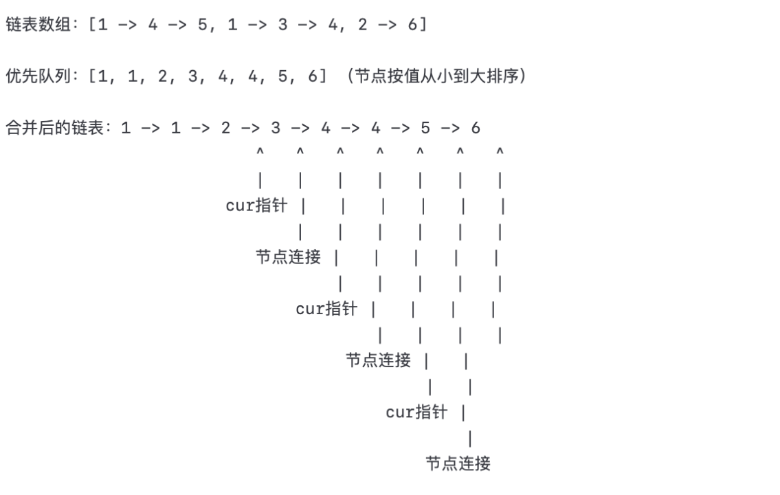 首先,我们需要定义一个优先队列(或最小堆)来存储链表节点。优先队列是一种能够按照节点值大小进行自动排序的数据结构。