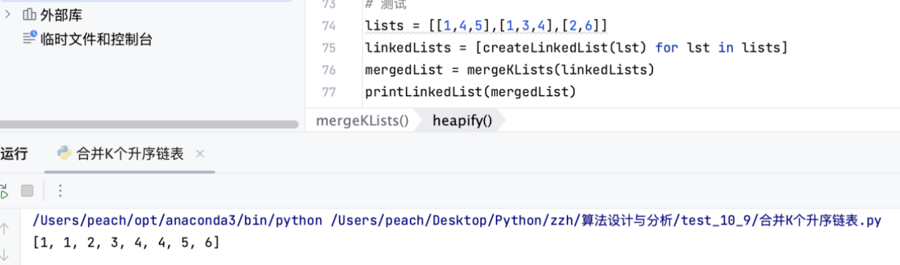 需要注意的是,在构建堆的过程中,我们只是将链表的头节点添加到了一个列表中,并没有将链表整个拷贝一遍,所以我们并没有使用额外的O(nk)的空间,而只是使用了O(k)的空间。