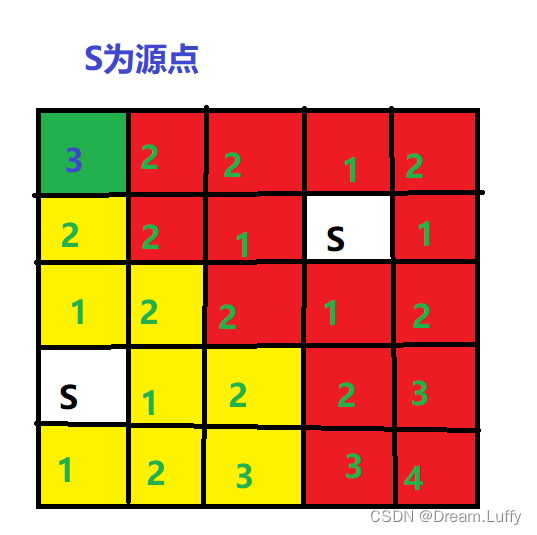 如果我们分别以每一个1为起点,遍历整个矩阵保留最小值,这时时间复杂度将是O(n^2)级别,