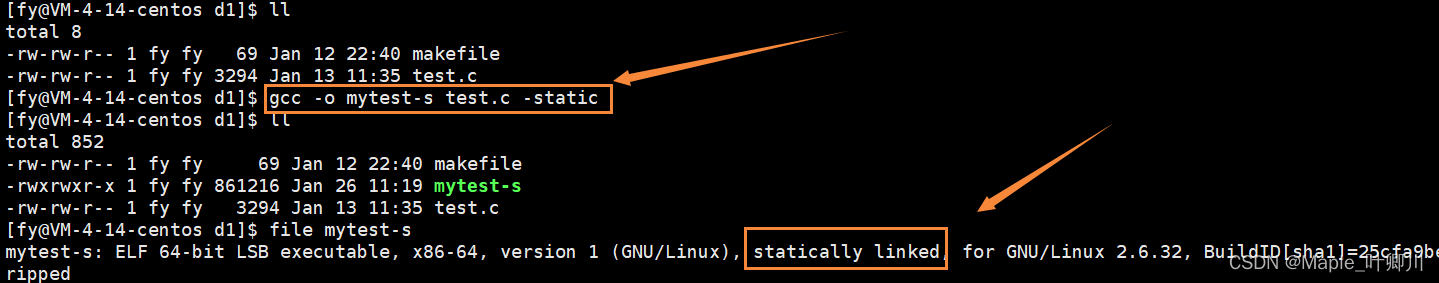 - 但是,假设动静态库同时给你,编译器只能把静态库拷贝到可执行程序里面,然后只能进行动态链接,哪怕只有一个动态库剩下的全是静态库,链接依旧是动态链接