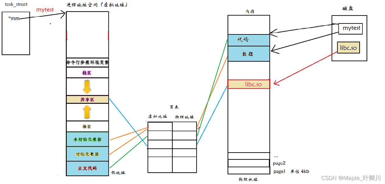 在可执行文件加载到内存时,所需要的动态库会从磁盘上加载到内存中,函数地址再由内存通过页表映射到这个可执行程序的共享区中,这个过程称为动态链接。动态库在多个程序间共享,节省了大量的磁盘空间和内存
