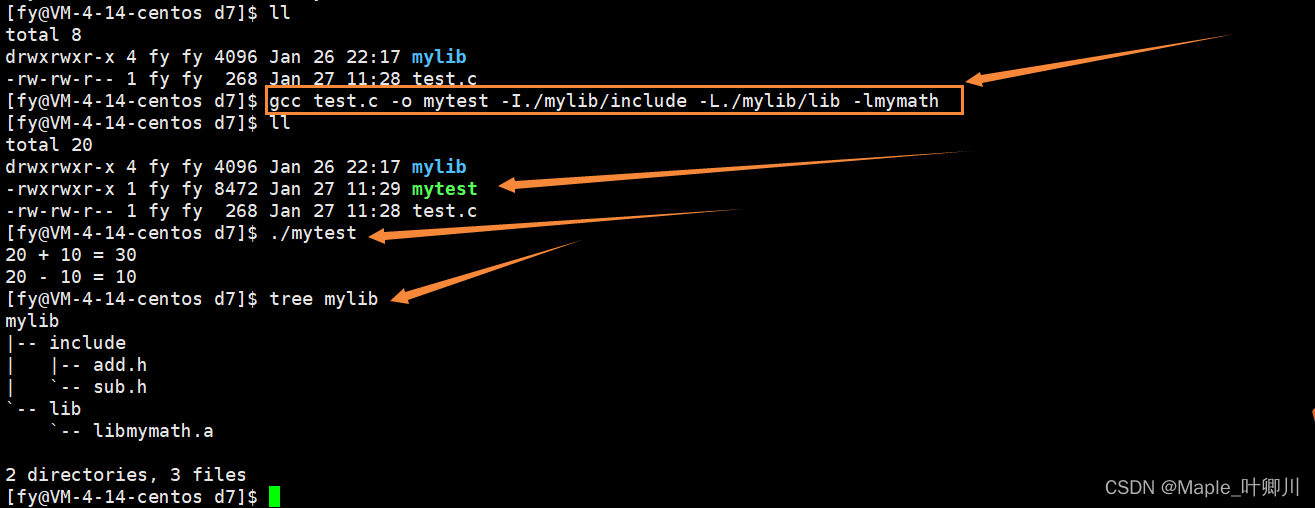 gcc test.c -o mytest -I./mylib/include -L./mylib/lib -lmymath