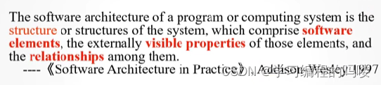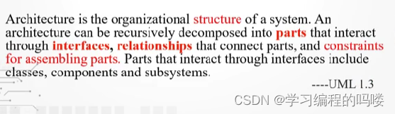 - 简而言之,构成系统的组件和组件间的关系或交互机制