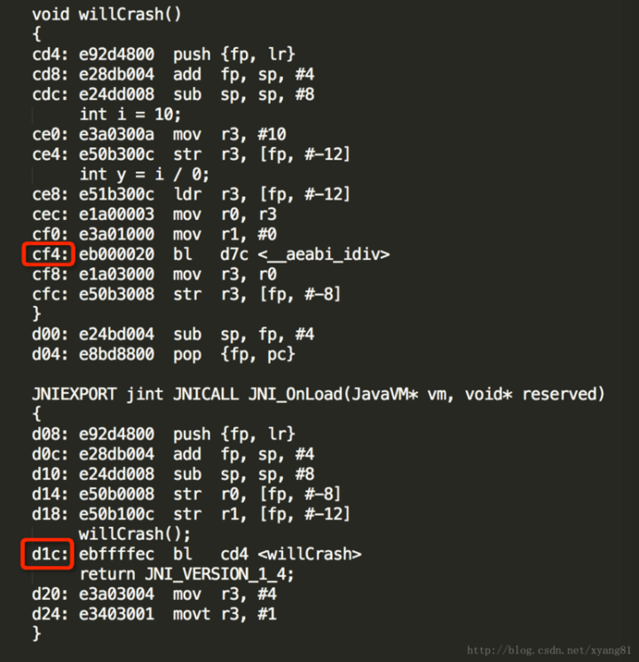 01-01 17:59:38.596: I/DEBUG(253): #00 pc 0002210c /system/lib/libc.so (tgkill+12) 01-01 17:59:38.596: I/DEBUG(253): #01 pc 00013165 /system/lib/libc.so (pthread_kill+48) 01-01 17:59:38.596: I/DEBUG(253): #02 pc 00013379 /system/lib/libc.so (raise+10) 01-01 17:59:38.596: I/DEBUG(253): #03 pc 00000e80 /data/app-lib/com.example.hellojni-1/libhello-jni.so (__aeabi_idiv0+8) 01-01 17:59:38.596: I/DEBUG(253): #04 pc 00000cf4 /data/app-lib/com.example.hellojni-1/libhello-jni.so (willCrash+32) 01-01 17:59:38.596: I/DEBUG(253): #05 pc 00000d1c /data/app-lib/com.example.hellojni-1/libhello-jni.so (JNI_OnLoad+20) 01-01 17:59:38.596: I/DEBUG(253): #06 pc 00052eb1 /system/lib/libdvm.so (dvmLoadNativeCode(char const*, Object*, char**)+468) 01-01 17:59:38.596: I/DEBUG(253): #07 pc 0006a62d /system/lib/libdvm.so 01-01 17:59:38.596: I/DEBUG(253): // 省略部份日志 。。。。。。