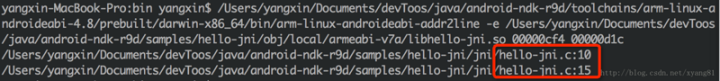 | ndk-stack -sym /Users/yangxin/Documents/devToos/java/android-ndk-r9d/samples/hello-jni/obj/local/armeabi-v7a