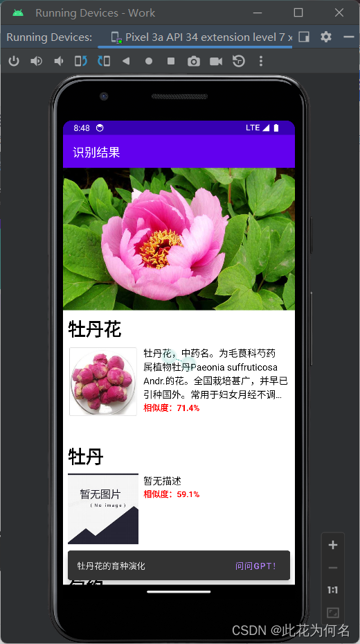 基于Android Studio实现拍照识花+ChatGPT的期末作业 基于Android开发的拍照识花+ChatGPT的项目。使用了网络技术调用了短信、植物识别、ChatGPT等API来完成主体功能;使用SQLite数据库保存相应的数据;利用RecycleView等相应的控件来完成相应的数据展示,并且与硬件交互,来上传照片识别植物。。