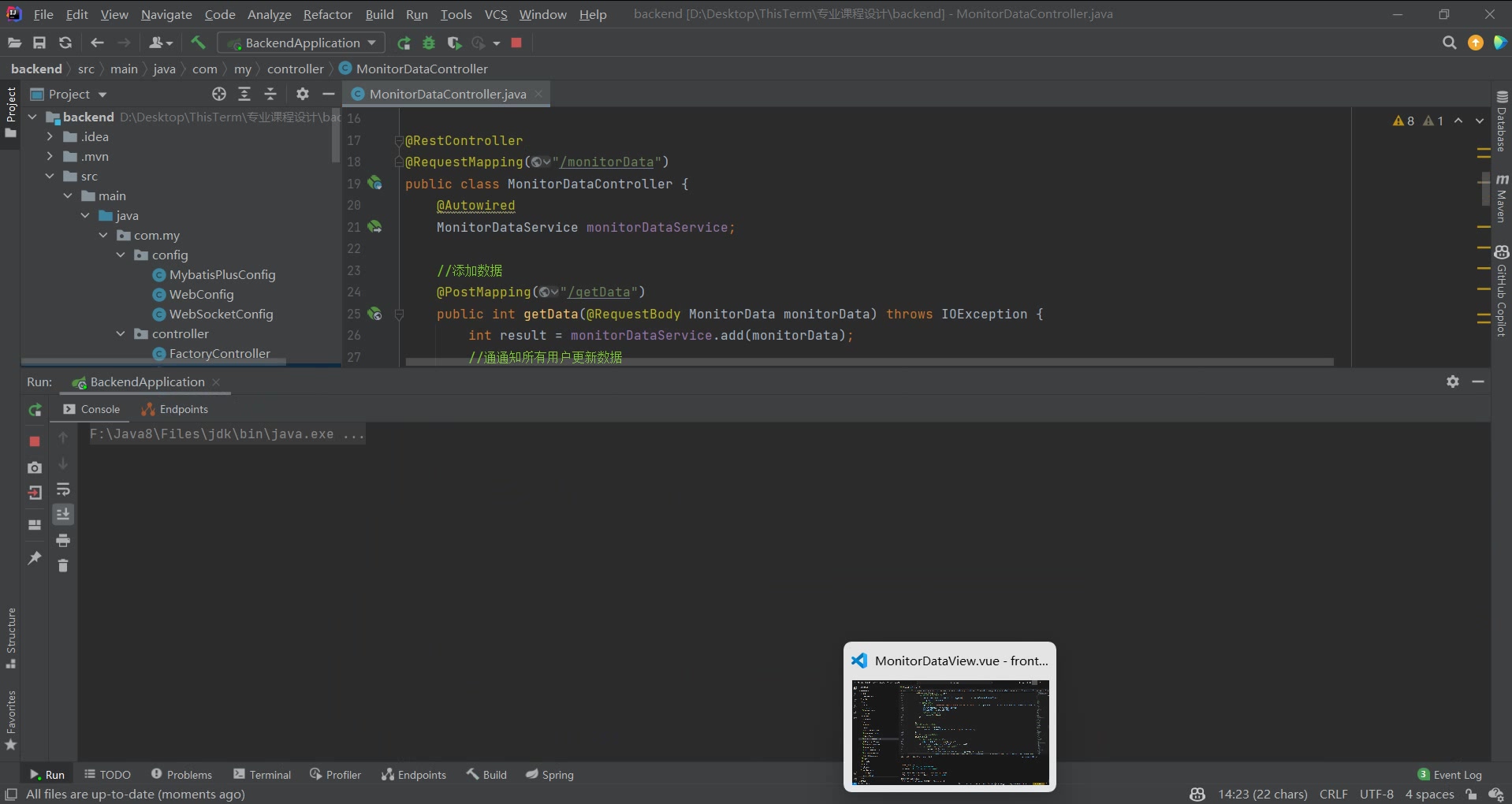 基于Springboot的发电机转轴监测系统 该项目为课程设计所编写。后端使用了Springboot+MybatisPlus等,前端使用了Vue,ElementUI,echarts等,并且使用了webSocket来完成模拟数据的成功发送后的实时更新。