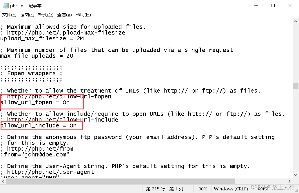 远程文件包含需要在配置文件php_ini中修改值,红色框内的值改为On,(这是改过的)