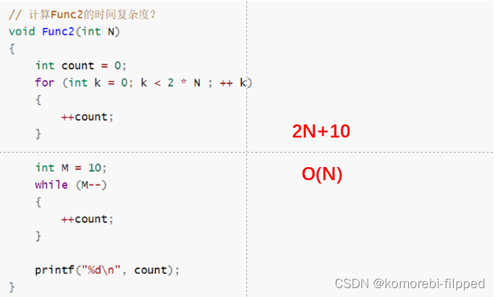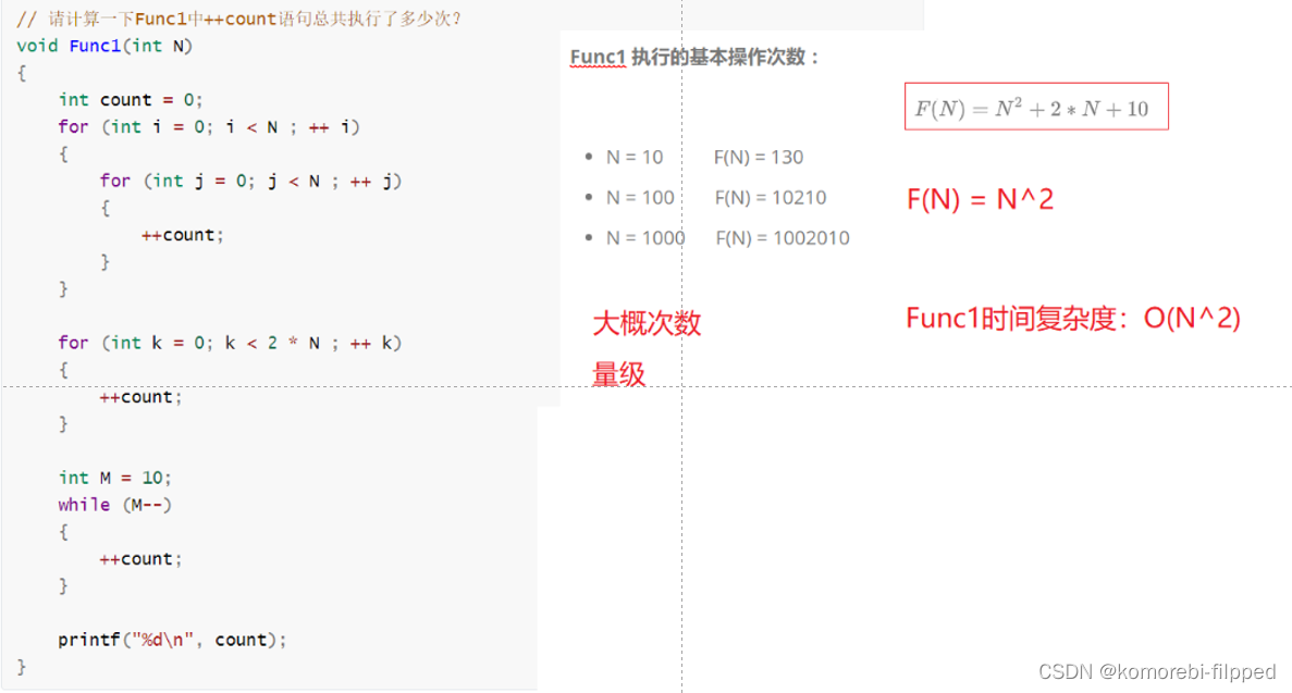 N = 10 F(N) = 130N = 100 F(N) = 10210N = 1000 F(N) = 1002010实际中我们计算时间复杂度时,我们其实并不一定要计算精确的执行次数,而只需要大概执行次数,那么这里我们使用大O的渐进表示法。![]()