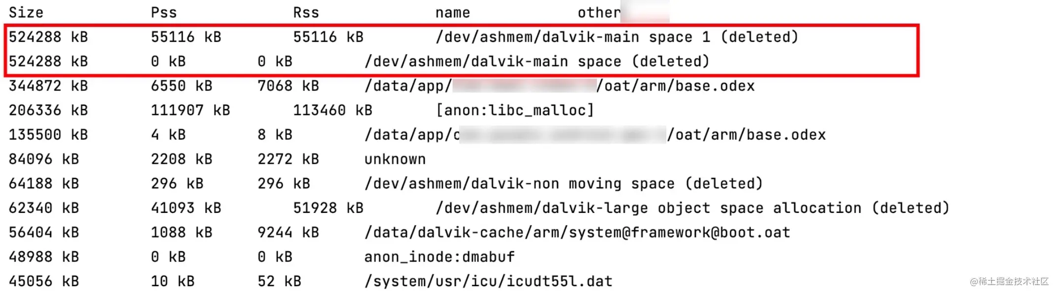 Java / Kotlin创建的对象。由 GC 管理和回收,GC 回收时将From Space里的对象复制到To Space,这两片区域分别为dalvik-main space和dalvik-main space 1, 这两片区域的大小和我当前测试机 Java 堆大小一样,都是 512 MB,如下图所示