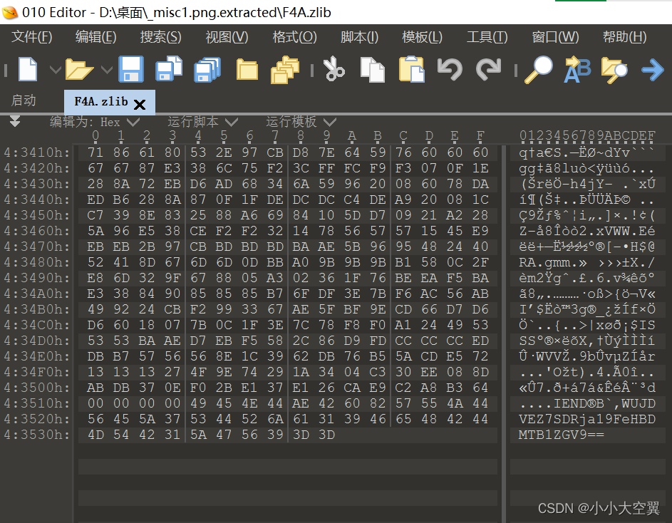 LSB隐写解题 ASS 附件下载后得到一张照片 将其用binwalk分离,发现确实有东西 将其用010editor打开,发现在F4A.zlib文件的末尾有一段base64编码 解码得到flag ypa 附件下载后得到一个压缩包