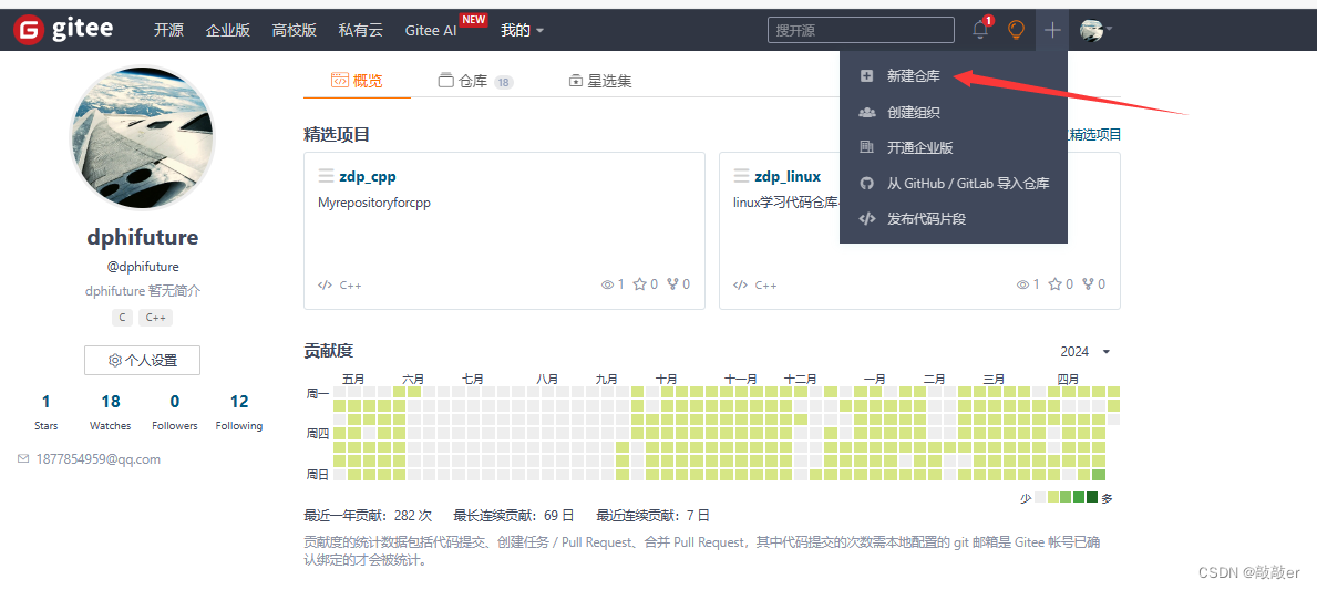 按提示注册账号后我们可以新建仓库,登陆成功之后,进入个人主页,点击右上角+号下面的新建仓库: