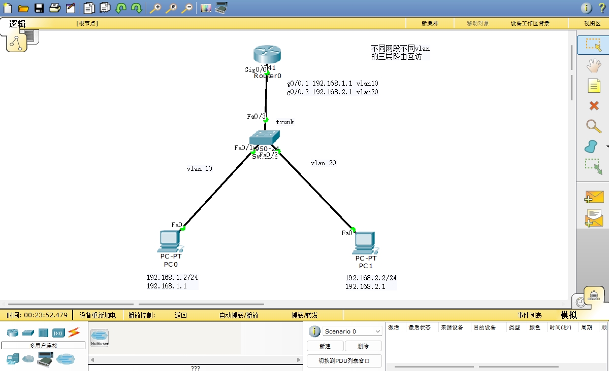 在单臂路由(Router-on-a-Stick)场景中,通过单个物理接口划分多个子接口,每个子接口绑定不同VLAN ID,实现跨VLAN的三层路由。子接口作为对应VLAN的网关,完成不同广播域间的通信。例如,子接口G0/0.10封装VLAN 10的流量,子接口G0/0.20封装VLAN 20的流量,实现VLAN间路由