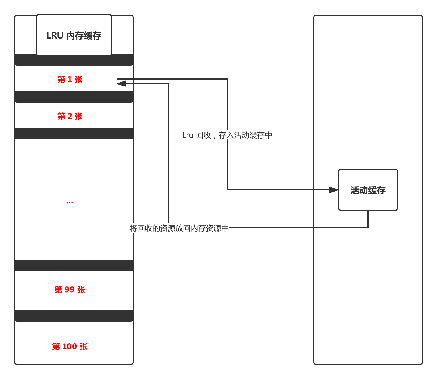 详细举例说明: 比如我们 Lru 内存缓存 size 设置装 99 张图片,在滑动 RecycleView 的时候,如果刚刚滑动到 100 张,那么就会回收掉我们已经加载出来的第一张,这个时候如果返回滑动到第一张,会重新判断是否有内存缓存,如果没有就会重新开一个 Request 请求,很明显这里如果清理掉了第一张图片并不是我们要的效果。所以在从内存缓存中拿到资源数据的时候就主动添加到活动资源中,并且清理掉内存缓存中的资源。这么做很显然好处是 保护不想被回收掉的图片不被 LruCache 算法回收掉,充分利用了资源。 我也不知道这样理解是否正确,希望如果有其它的含义,麻烦告知一下,谢谢 !