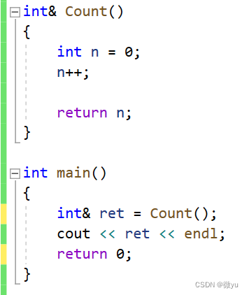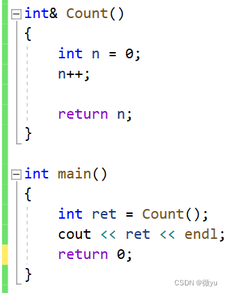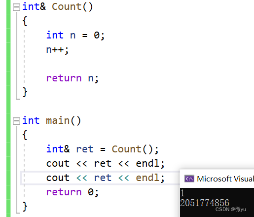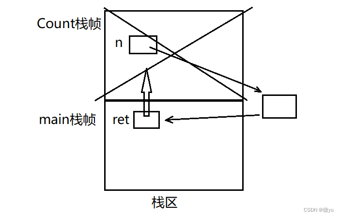 右图的意思是tmp和ret都是n的别名, tmp是在返回的时候定义的, Count函数栈帧销毁的时候, 还是把这块空间返回到了main函数的栈帧中。