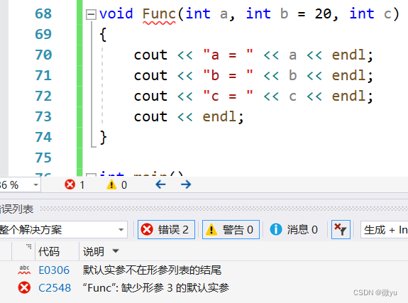 2. 缺省参数不能在函数声明和定义中同时出现,比如在头文件中声明的缺省参数是10,在.cpp文件中定义的缺省参数是20, 这样编译器就不知道该用哪个值了。