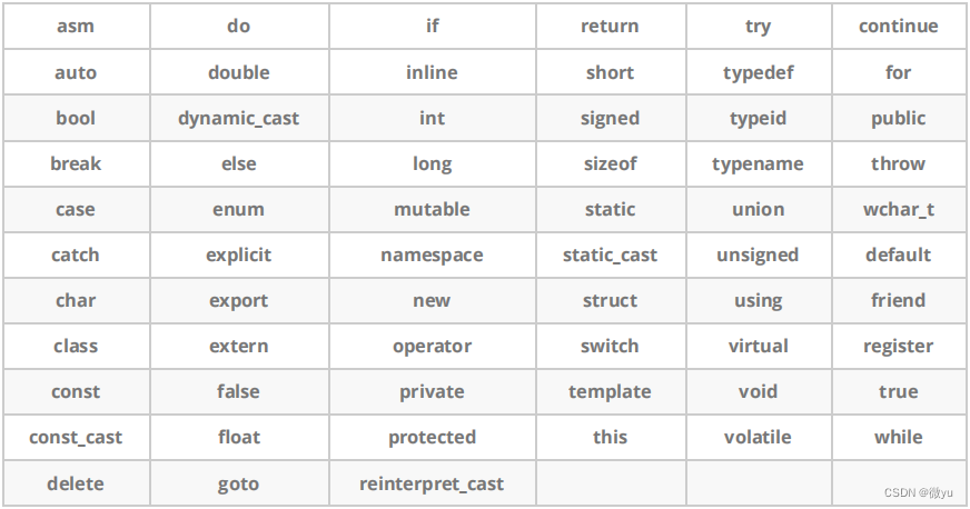 C++总计63个关键字,C语言32个关键字:![]()