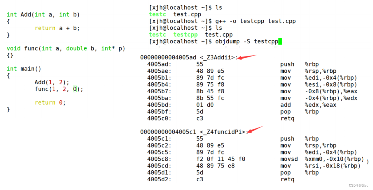 这里我们要回顾一下以前的知识,在运行到执行文件前,要经过:预编译,编译,汇编,链接这些阶段其实问题就出在编译完之后的汇编阶段,因为在这里C++和C语言有着些许的不同,这里使用linux操作系统可以明确地看出区别。下面我们来看看: