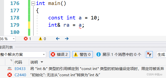 看最下面那个错误,无法从"const int"转换为"int &",const修饰的a只有读的权限,而引用的ra具有读写的权限,这是明显的权限被放大了,改为const int& ra = a;就可以了。