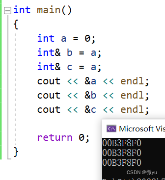 引用不是新定义一个变量,而是给已存在变量取了一个别名,编译器不会为引用变量开辟内存空间,它和它引用的变量共用同一块内存空间。类型& 引用变量名(对象名) = 引用实体&这个符号在这里就不是取地址的意思了。定义一个变量a, 然后b是a的别名, 可以看到一开始都是0, 改变a, b也跟着改变, 改变b, a也跟着改变, 最后两个变量的地址是一样的, 也就是共用同一块内存空间。![]()