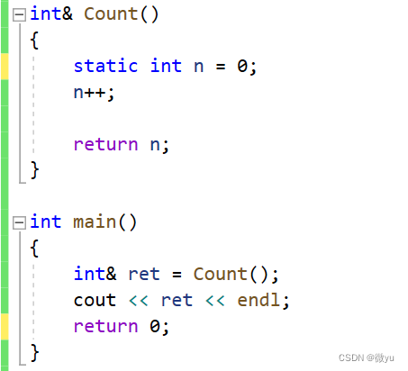 左图调用函数, 在静态区创建了n, 因为static定义的全局变量, 当Count函数调用完之后, 这块函数栈帧会被销毁, 返回位于静态区的n。