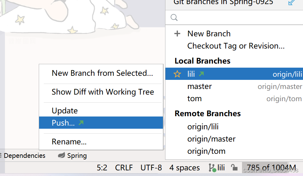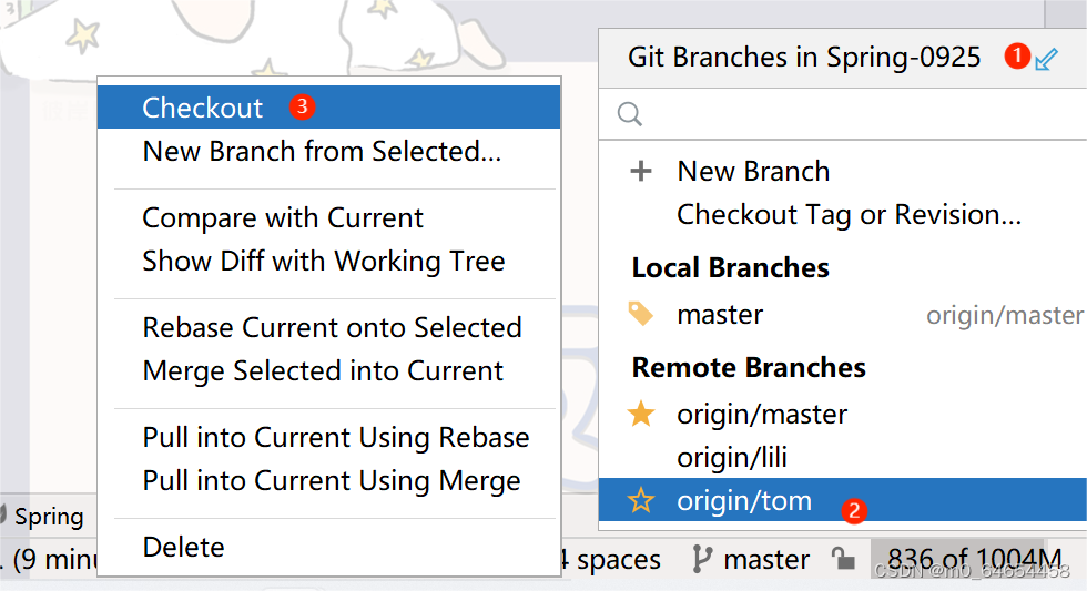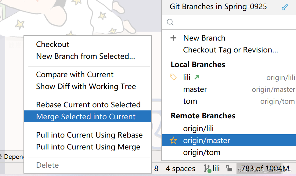 切换到lili分支,点击远程节点的master选择Merge Selected into Current