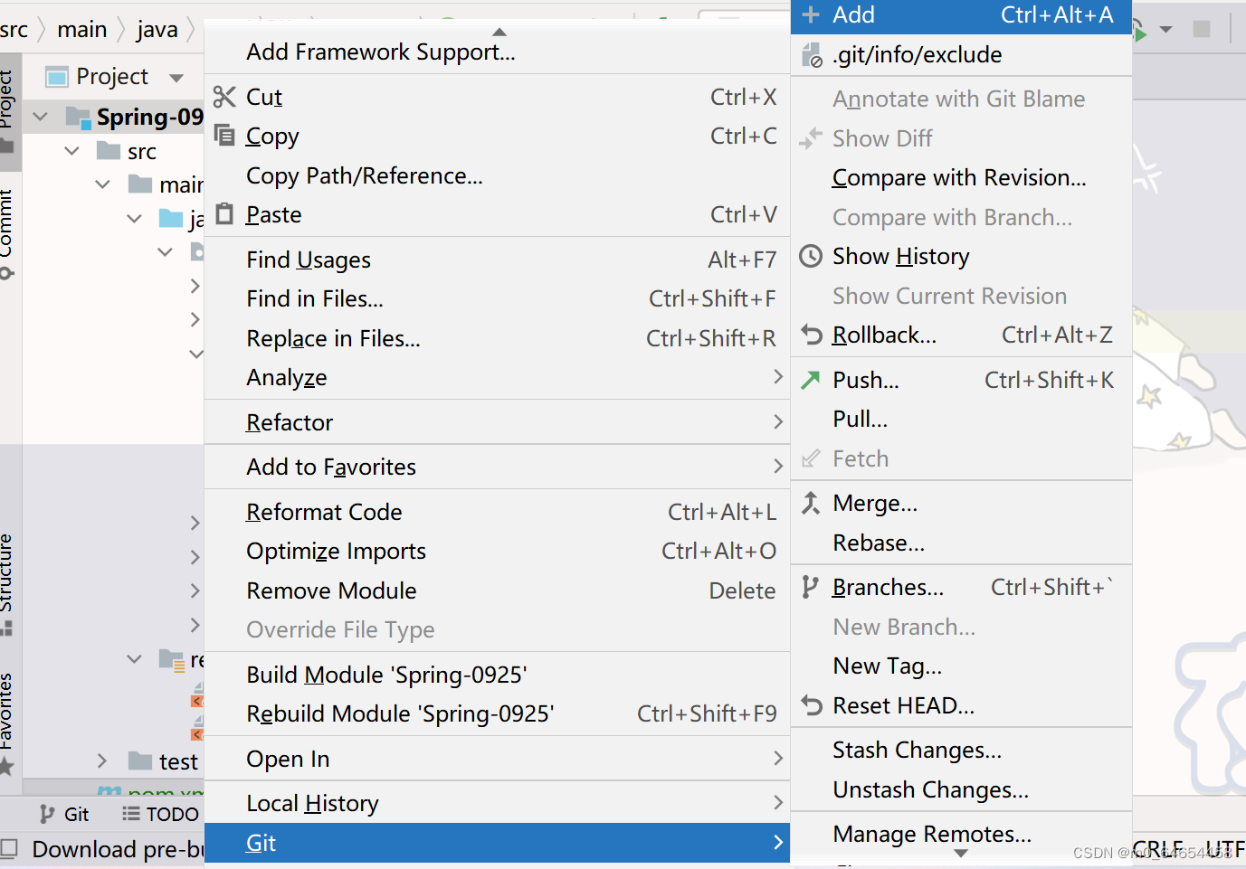选中要添加到暂存区的项目,右键-->Git-->+Add