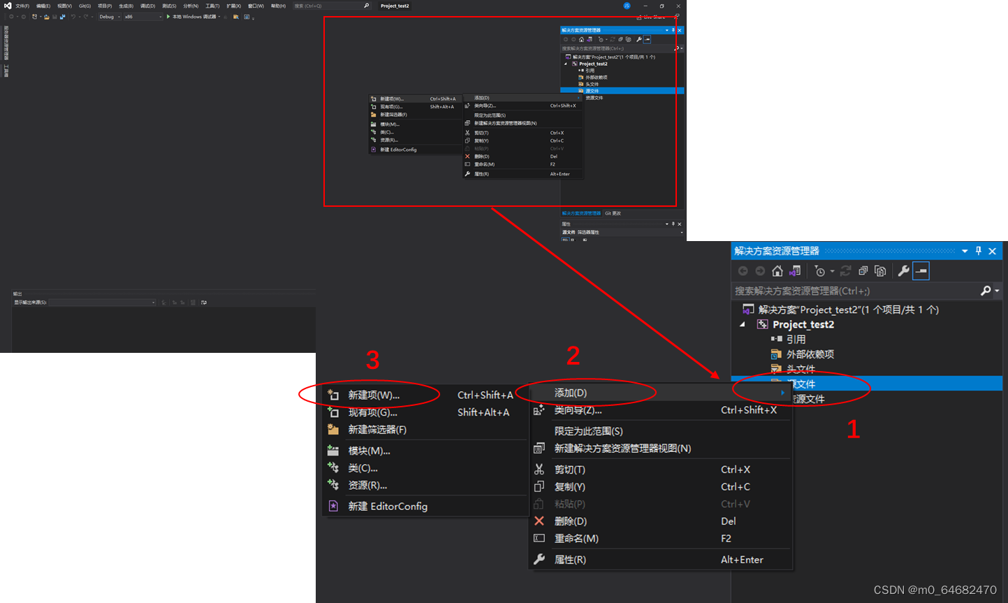 5、选择解决方案资源管理器中的源文件中右击->左击添加->左击新建项