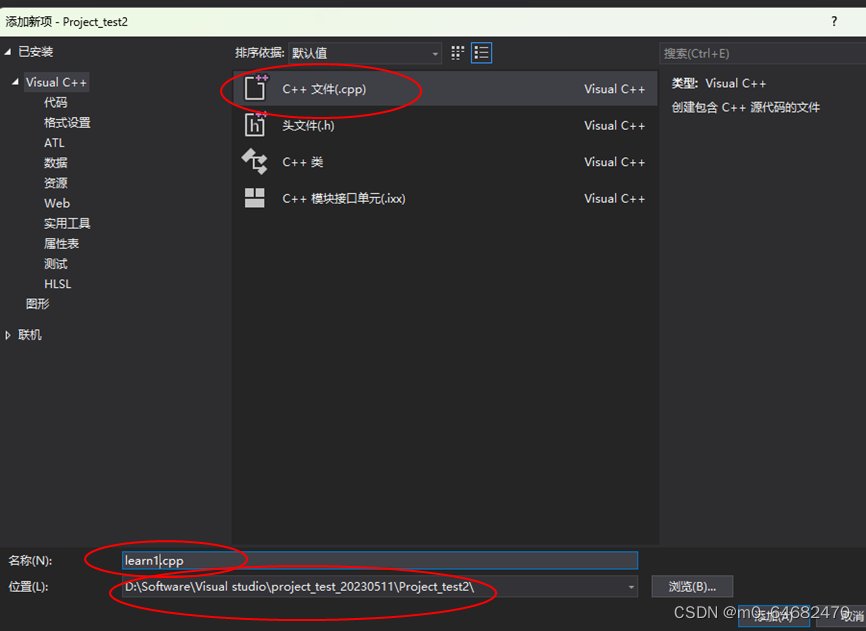 6、然后选择C++文件cpp->填写名称和保存的位置,可以自己修改文件名