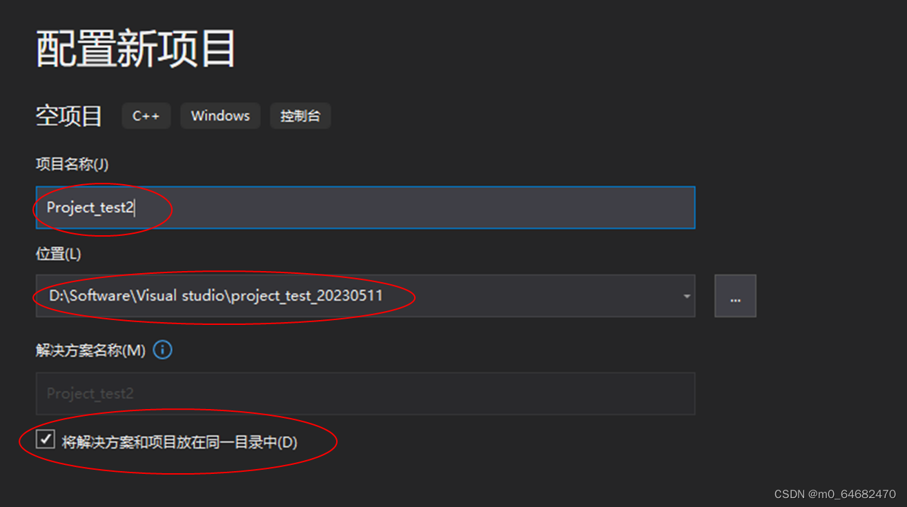 4、填写项目名称、位置,并勾选将解决方案和项目放在同一目录中