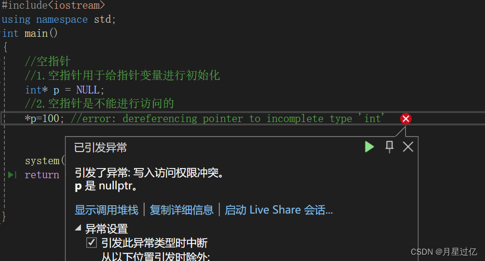 注意:空指针指向的内存是不可以访问的