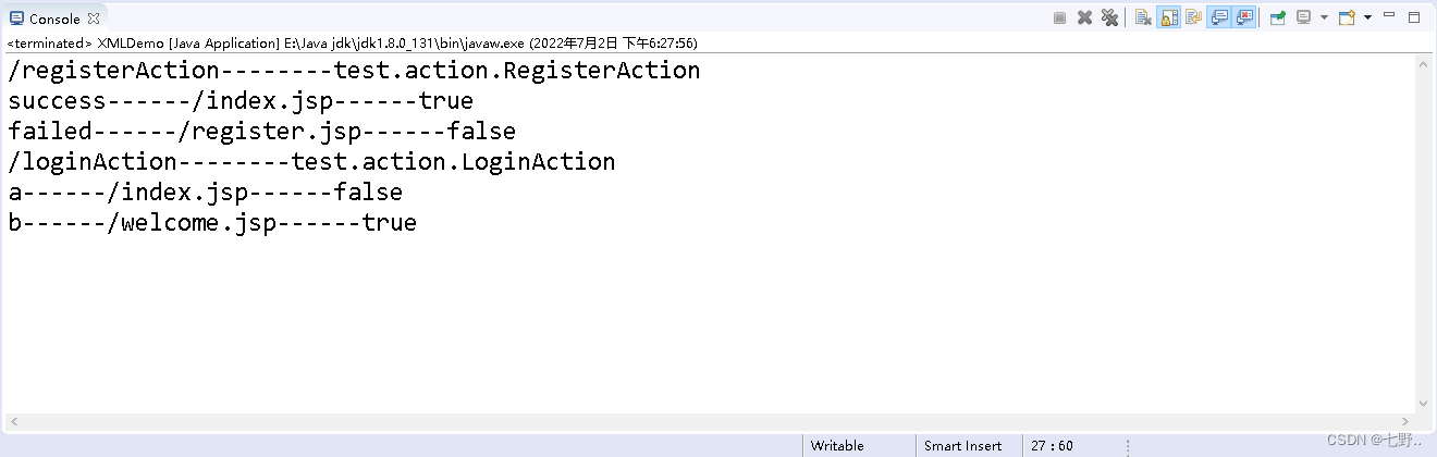 package com.zking.demo; import java.io.InputStream; import java.util.List; import org.dom4j.Document; import org.dom4j.Element; import org.dom4j.io.SAXReader; public class XMLDemo { public static void main(String[] args) throws Exception { InputStream is = XMLDemo.class.getResourceAsStream("/config.xml"); SAXReader reader = new SAXReader(); Document doc = reader.read(is); Element element = doc.getRootElement(); List<Element> list = element.selectNodes("/config/action"); for (Element e1 : list) { String path = e1.attributeValue("path"); String type = e1.attributeValue("type"); System.out.println(path+"--------"+type); List<Element> list2 = e1.selectNodes("forward"); for (Element e2 : list2) { String name2 = e2.attributeValue("name"); String path2 = e2.attributeValue("path"); String redirect2 = e2.attributeValue("redirect"); System.out.println(name2+"------"+path2+"------"+redirect2); } } } }结果就是: